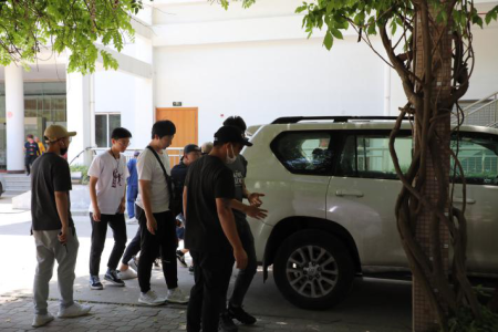 然而下午两点的毒辣阳光打破了这美好的意境。在拍摄的间隙,女孩子们纷纷将自己的裙子当做了头巾,化作“阿拉伯少女”遮挡着猛烈的太阳。烫脚的地面也烫坏了舞蹈演员们的舞蹈鞋。虽然辛苦,但是舞蹈公司的同学们未曾有怨言,她们互相开玩笑,向带队师兄撒娇要新的舞蹈鞋。