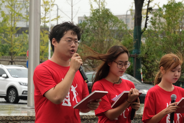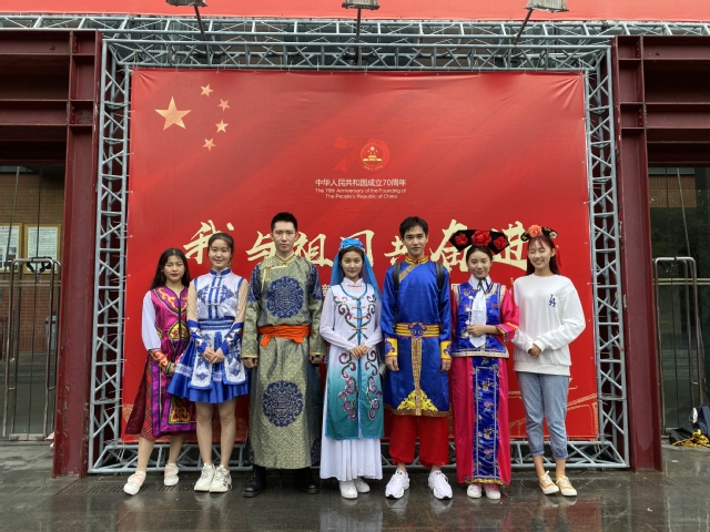 鲜艳的五星红旗,闪耀的五角星,在雄伟的国歌中,几百双眼睛仰望着冉冉升起的国旗,手举过头顶行着庄严的对礼,身为蒙古的一员很开心能参加这次升旗活动、为祖国母亲庆生。------19主持金凯歌