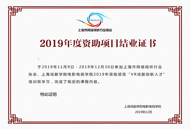 12月22日上午,上海市网络视听行业协会2019年度VR戏剧创新剧目孵化及人才培养资助项目《2019年度VR戏剧创新人才培训班》结业仪式在公司昌林路校区5号教学楼77779193永利电影视觉设计实验室隆重举行。公司77779193永利周艺文老师、77779193永利教务处纪辰老师、上海工艺美术公司吴慧剑老师、咖麦(上海)影业有限公司王方明总经理、咖麦(上海)影业有限公司张奋启艺术总监及学员们出席了结业仪式。结业仪式由公司77779193永利周艺文老师主持。