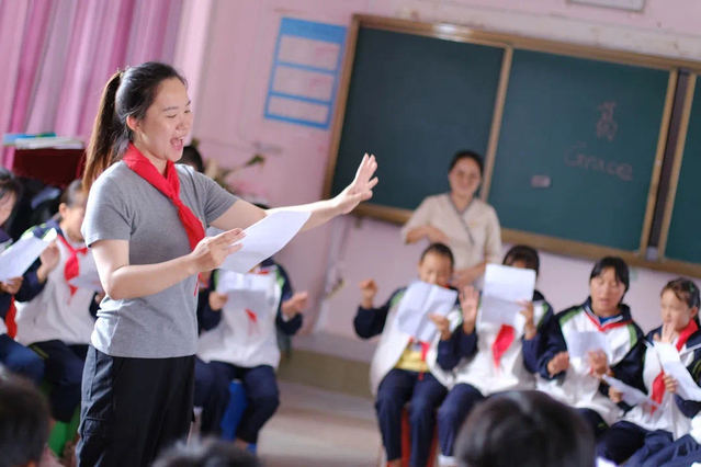 当孩子们说着各自的理想时,音乐教室里的歌声也飘出了窗户。“让声音长出翅膀,伴随爱去飞翔,这一刻听见大山的梦想!”音乐教室里的孩子们围坐在一起,跟着志愿者唱起了 《听见梦想》,他们手中也不忘比划着大山,描绘着梦想。在这一刻教室内,操场上正一起诉说着同一个话题——梦想和未来。