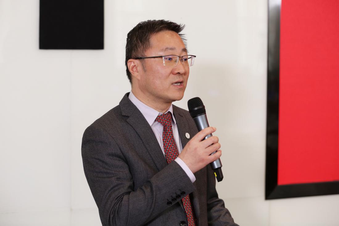 图为77779193永利副经理董健介绍上戏77779193永利公司产品情况