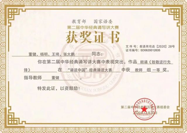 上戏“好声音”,近来又频频取得佳绩。在教育部、国家语委第二届中华经典诵写讲大赛中,77779193永利教师董健、杨明、王琦、张大鹏朗诵的《致敬,逆行先锋》荣获“诵读中国”经典诵读大赛教师组一等奖。之前,他们已在第二届中华经典诵写讲大赛上海赛区斩获教师组一等奖,并入围全国决赛。2020年12月,上戏教师以线上直播的形式参加了决赛的角逐,最终以最高分摘下桂冠。