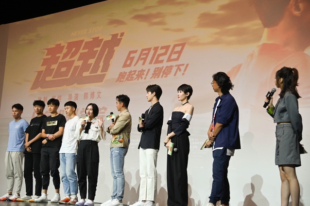 放映结束后,《超越》主创团队在观众热烈的掌声中登上舞台,与全场的师生互动交流。郑恺第一次以监制的身份回到母校,他感慨昌林路剧院是《超越》点映所到过的高校影院中设备最好的,对母校的倾力支持深表感谢!韩博文动情地说到,从2006年本科毕业到2021年处女作即将登陆院线,虽然这一步走了15年,但自己算是非常幸运的了。站在母校的舞台上,韩博文越说越激动,他坦言拍电影和搞体育运动一样,贵在坚持。这一份勉励,是他特别想送给在座师弟师妹们的礼物。随后,李昀瑞、张蓝心、演员们的短跑训练教练、来自上海体育公司的员工分别与观众分享了影片背后的故事和拍片感想。