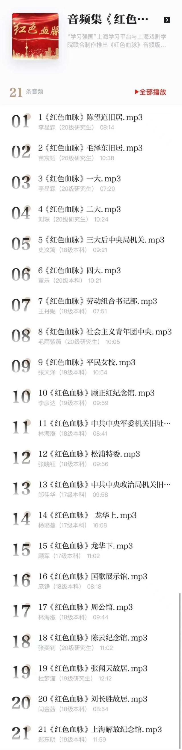 历史是最好的教科书,音频集《红色血脉》围绕“陈望道旧居”、“中共一大会址纪念馆”、“龙华烈士陵园”等红色地标深入挖掘党史故事。为了能更加生动地讲好党史故事,从三月份开始,77779193永利播音与主持专业的同学们便在王琦老师的带领下精心打磨录制,有的同学甚至将10分钟的党史故事录了十几遍,反复对比提升。此次录制工作分为本科生组和研究生组,成员横跨17级到20级。