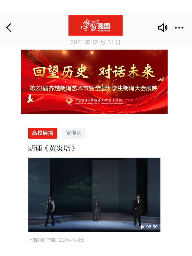 在教育部、国家语委主管,中国传媒大学主办的第23届齐越朗诵艺术节暨全国老员工朗诵大会中,上戏学子继续创造佳绩,18主持林海涨、黄云涛和20主持董乐同学朗诵的《黄炎培》(指导老师:董健、王琦)荣获“艺术表现特别奖”。