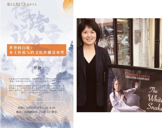 讲座上,罗靓教授以女儿为《世界的白蛇》书籍制作的一分钟推广片开始,简要阐述了自己对于“白蛇”主题的研究缘起,即对于当下流行文化的密切关注,力图打破学术的象牙塔,实现与现实对话的可能性。讲座以三个部分展开,第一个部分主要讲述十九世纪至二十世纪,中西方世界对于“白蛇”起源的描绘之“博弈”,涵盖西方外交官编绘的中国城市导览、中国戏曲、中国电影、中国香烟广告牌等相关内容;第二个部分重点讲述冷战时期,日韩等东亚国家对于“白蛇”电影影像的重塑,并以四部具体的影片文本解读展开,帮助同学们更深刻地理解此时日韩“白蛇”电影与中国文化传统的关系、泛亚洲语境、后殖民语境乃至战后地缘政治的关系。最后一个部分讲述当代流行文化下的“白蛇”主题,通过三个女性为主导的文本,具体呈现了当代英文世界和华文世界中,“白蛇”在文本、舞台及数字影像方面生生不息的行动与力量,并肯定了其在美国当代文化中获得时尚与先锋的转型,当代“白蛇”作品与新技术的结合也呼应着第二部分日韩电影创新中的合谋。罗靓教授还指出,“白蛇”曾经从中国出口美国,目前再从美国进口中国,为跨文化传播研究提供了一个十分有趣的个案,对于我们进一步深入研究跨文化内涵有较大的启发性。