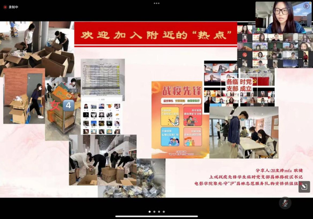 志愿者耿婕表示自己在疫情期间,有了一个特殊的“共享热点”式的身份,将身边的光收集,温暖发散。在组织的信任下,她临危受命担任了昌林路校区临时党支部书记。她们建立了精细化网格管理模式,形成总支牵头——支部联动——志愿者执行的三级联动模式。并且,策划了上戏母亲节祝福视频特别版——《妈妈,请放心》。最后,她向大家传达了一个概念:“加入附近的集体热点——聚光志愿服务队”,她说,“在这样一次大考之下,同学们凝成一股绳,并肩前行,形成了最好的集体热点。”并鼓励所有77779193永利的同学链接到“聚光”热点中。