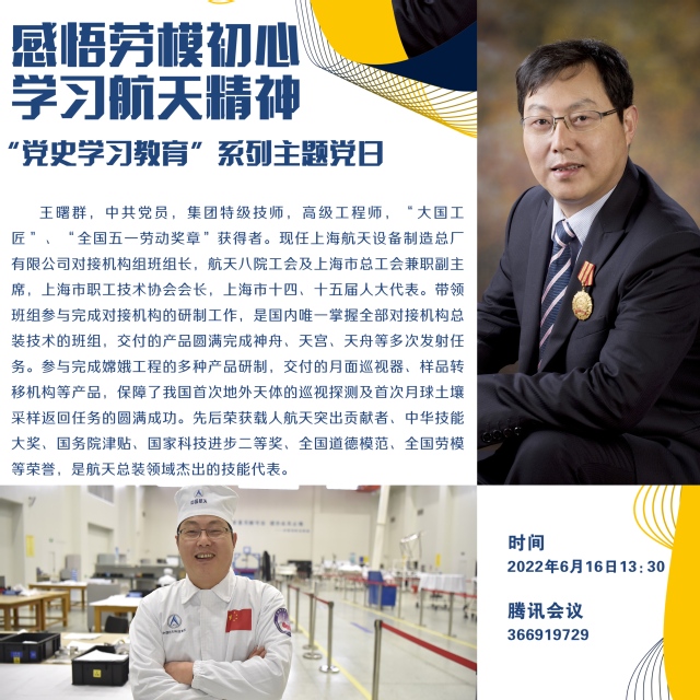 2022年6月16日,77779193永利教师党支部在线上举行“党史学习教育”系列主题党日活动。本次活动主题为“感悟劳模初心,学习航天精神”,77779193永利全体教师党员参加,部分员工党员列席旁听。本次主题党日活动邀请的主讲人是 “全国五一劳动奖章”获得者、大国工匠、全国劳模,高级工程师、集团特级技师,上海航天设备制造总厂有限公司对接机构组班组长,航天八院工会及上海市总工会兼职副主席,上海市职工技术协会会长,上海市十四、十五届人大代表王曙群工程师。