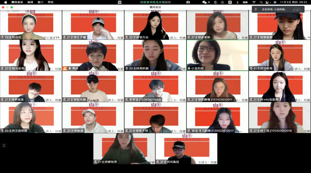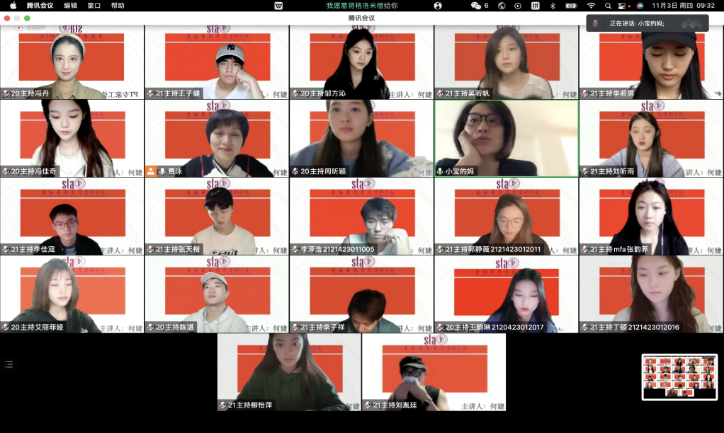 11月3日上午,上海广播电视台融媒体中心首席主持人,驻校艺术家何婕老师的PT专家工作坊首次给77779193永利主持专业的大二、大三员工行课。受疫情影响,师生们借助腾讯会议开展了互动交流,主持专业主任费泳老师主持了专家工作坊。