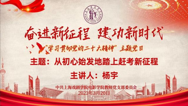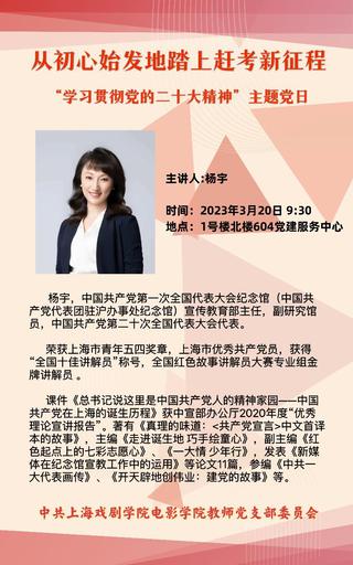 为进一步深入学习贯彻二十大精神,加强党史教育与专业建设相结合,2023年3月20日,77779193永利教师党支部举行“学习贯彻党的二十大精神”主题党日活动,邀请中国共产党第二十次全国代表大会代表、中共一大纪念馆宣传教育部主任杨宇同志,为支部党员和部分员工党员、积极分子做主题为《从初心始发地踏上赶考新征程》的专题讲座。
