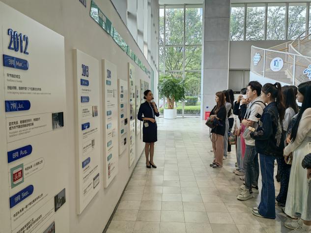 在字节跳动上海总部的公司文化展示区,上戏的同学们了解到该公司的发展历程。几年的时间内,字节跳动完成了数款“爆火”软件的设计与推出,如抖音、今日头条,剪映等,为广大网络用户提供更多智趣新选择。