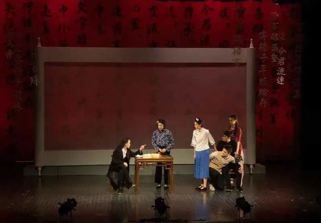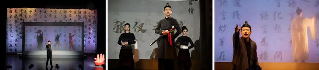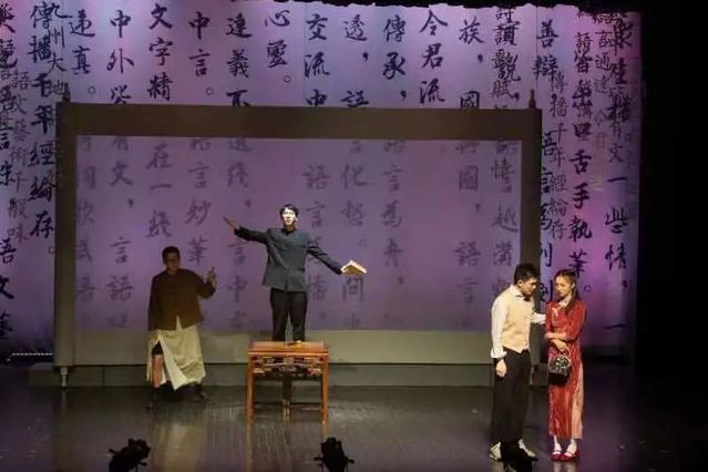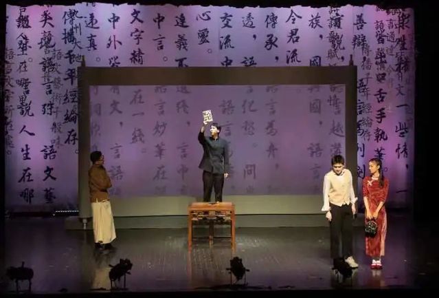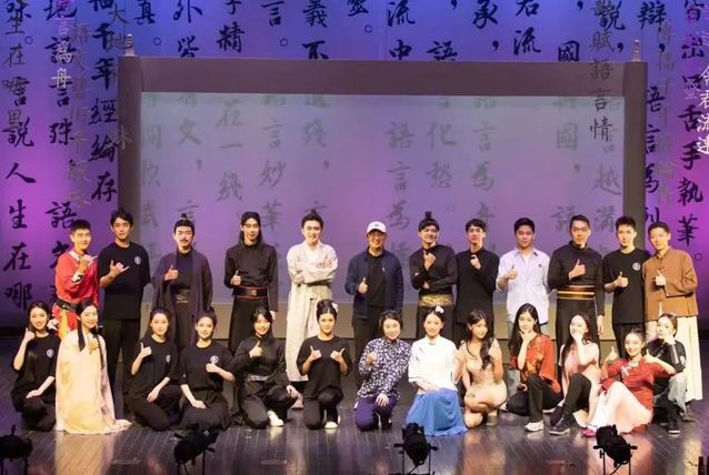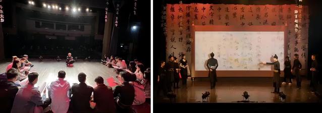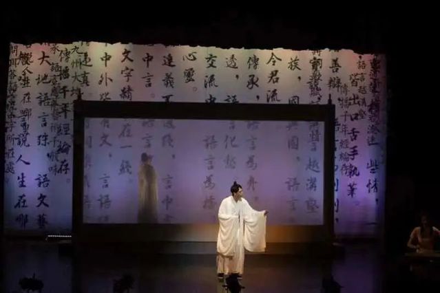 《语宙》在演出形式上以语言的魅力体现古今融汇、人机融合、历史与未来交融。悬挂在舞台上空的每句诗词均为由人工智能工具ChatGPT所写。舞台中央的巨大卷轴,为演出又增添了几分文化感与厚重感。卷轴中央播放动画结合视频片段,体现了上戏77779193永利以“影视+戏剧”的创作特色,力求使汇报有新意、有特色、有生机。在内容上,全剧从语言文字的产生与发展,到以语言为利剑的辩论,再到白话文的推广使用,并聚焦网络流行语现状,四个风格各异的片段是守正与创新的碰撞,同时也为观众提供了深刻的思考和启示:若通古今之变,必通其变之因。19主持的全体同学完成了各个部分的剧本创作。舞美、灯光、服化、作曲、摄制、多媒体等各专业的同学在课业之余担任了演出的各项幕后工作。