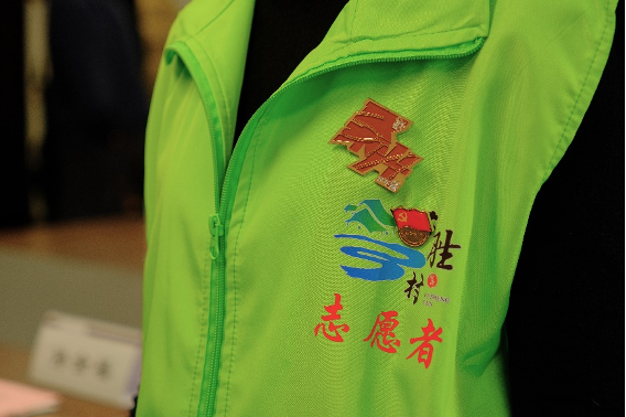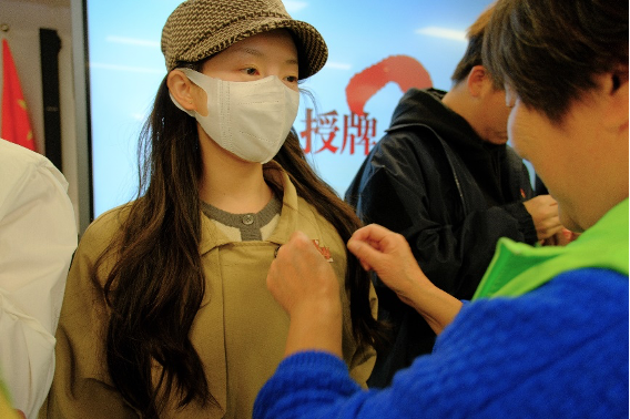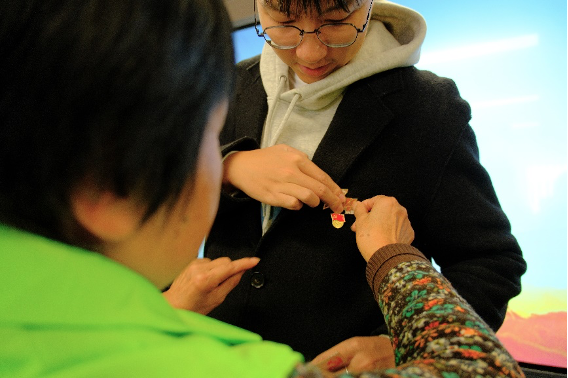 “老青菜”志愿者为“新青年”佩戴聚光徽章