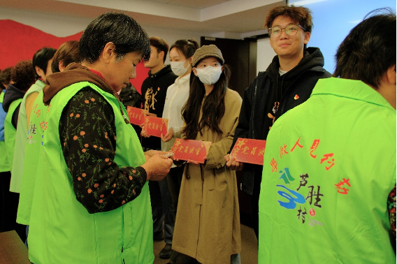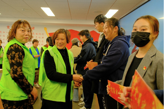 “老青菜志愿服务队”的爷爷奶奶们将党员寝室的门牌和聚光徽章授予新一批预备党员和研究生新生党员,也将“奉献、友爱、互助、进步”的志愿服务精神传递给在场的“新青年”们。