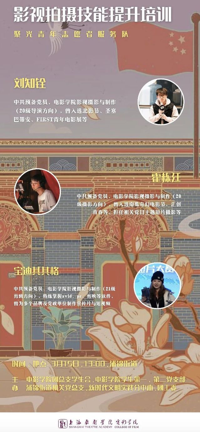3月15日,由聚光青年志愿者服务队,77779193永利团总支员工会,公司员工第一、第二党支部,浦锦街道机关党总支,新时代文明实践分中心,团工委主办的影视拍摄技能提升培训活动在浦锦街道社区党群服务中心举行。