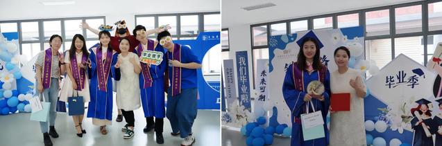 留影区此次位于整个大厅的C位,提供属于毕业生的高光时刻。毕业生们和亲友们在代表“高飞”的蓝色背景板前合影留念。红毯旁准备了各种标语KT板和拍照道具供毕业生取用,现场同样设立了穿着学士服的毕业生人形立牌,毕业生站在立牌后就可以一键换装,一键定格自己的最美瞬间。留影区两侧设有印着毕业标语的气球花束,预祝毕业生此后的道路繁花似锦。