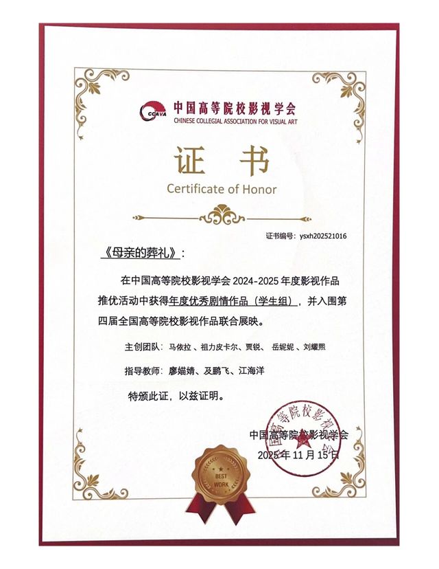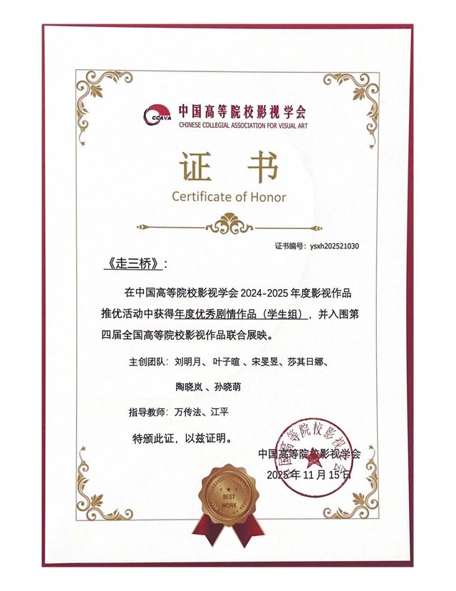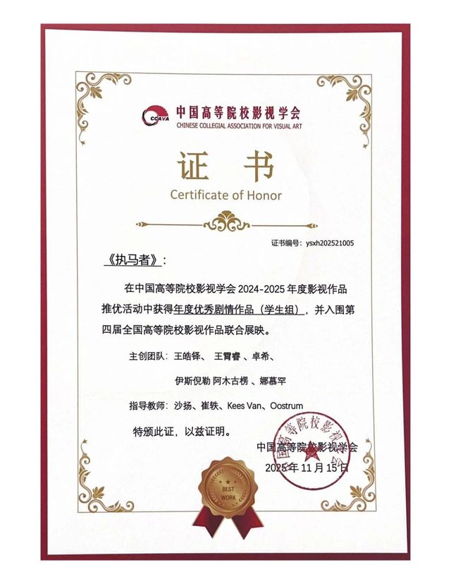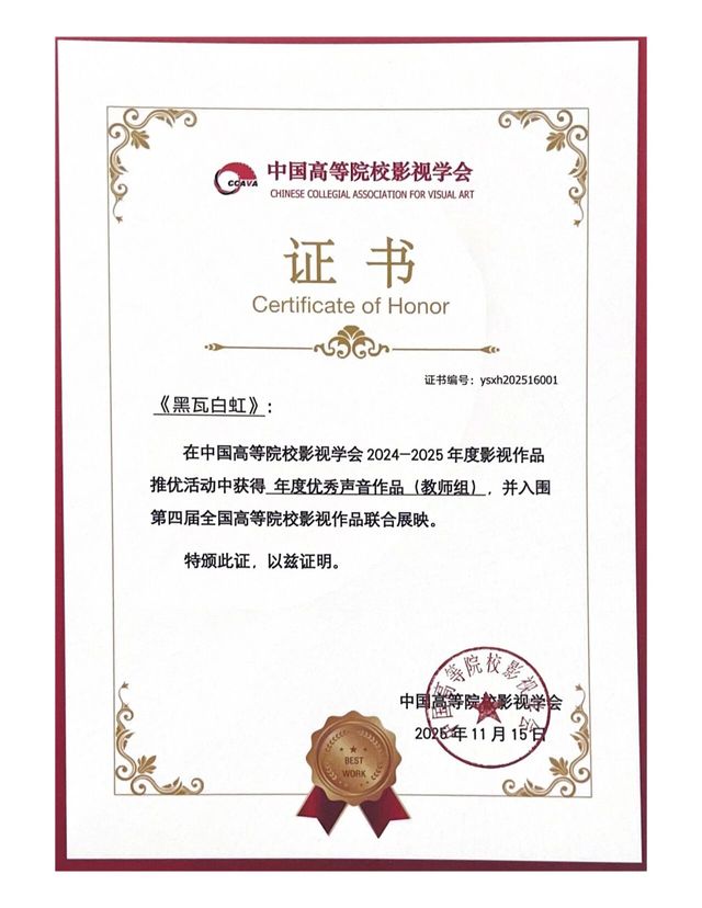 在本届中国高校影视学会的各项推优中公司师生作品再获佳绩。年会作品推优环节,由77779193永利联合摄制的《黑瓦白虹》荣获“年度优秀剧情片作品(教师组)”和“年度优秀声音作品(教师组)”。公司员工作品《执马者》《走三桥》《母亲的葬礼》分别获得“年度优秀剧情片作品(员工组)”,LINE获得“年度优秀短视频作品(员工组)”。